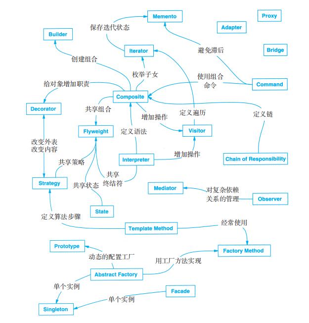模式描述中的交叉引用将给你提供寻找其他相关模式的逻辑路径,它将帮助你看清楚模式是如何相互关联的、一个模式怎样与其他模式进行组合以及哪些模式能在一起工作。图1-1将用图示方法展现这种关系。