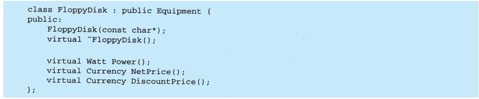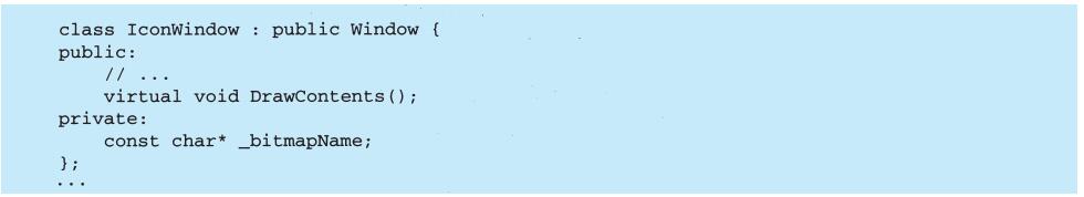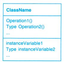 图B-1a是以OMT符号表示的抽象类和具体类。一个类表示为一个线框,在顶部以粗体写着类名,其下是主要的操作,再下是实例变量。类型信息是可选的。我们使用C++的书写习惯,将类型名置于操作名(强调返回类型)、变量名或参数之前。斜体表示该类或操作是抽象的。