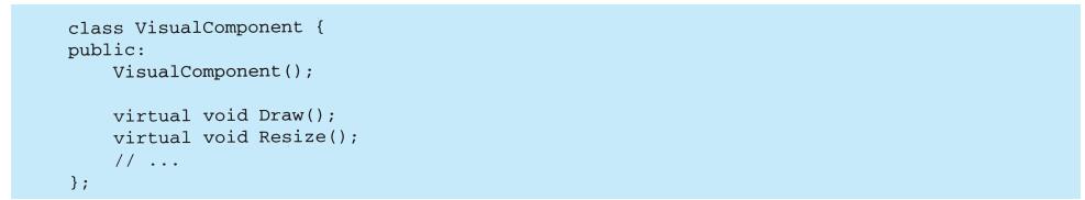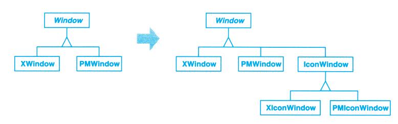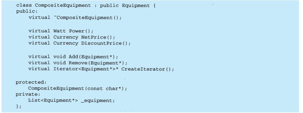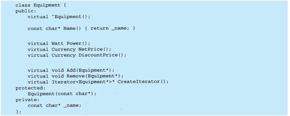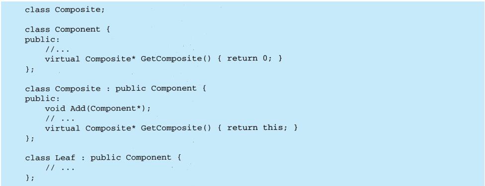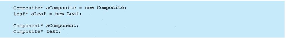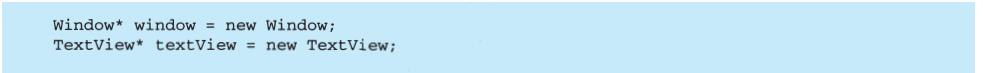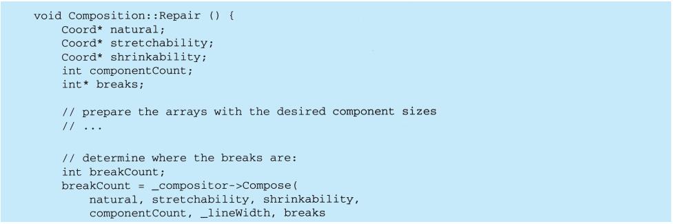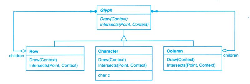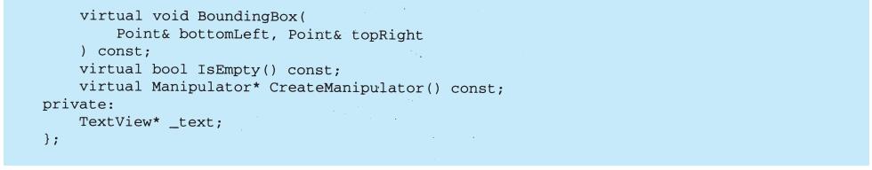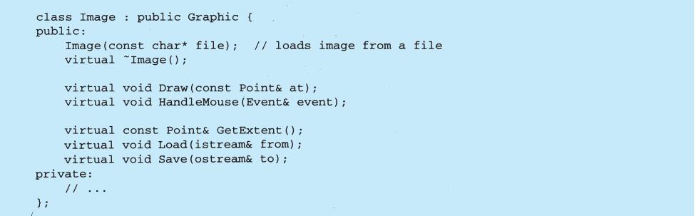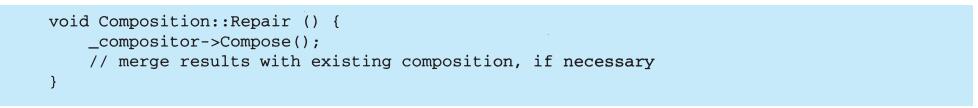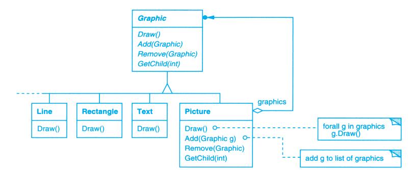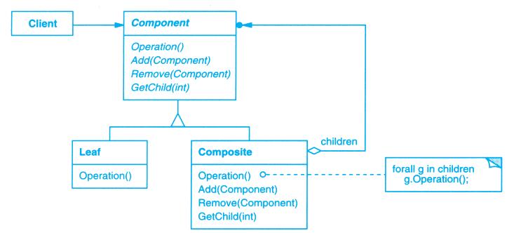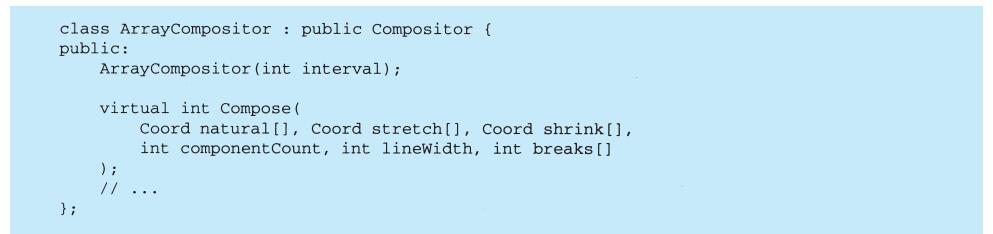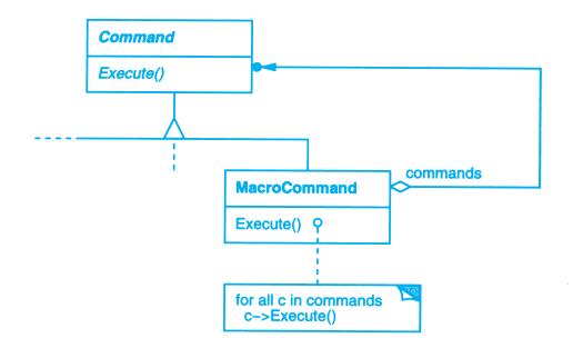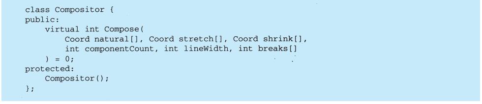 上例反映了可以将组合视图与其构件平等对待的设计,同样,该设计也适用于更一般的问题:将一些对象划为一组,并将该组对象当作一个对象来使用。这个设计被描述为Composite(4.3)模式,该模式允许你创建一个类层次结构,一些子类定义了原子对象(如Button)而其他类定义了组合对象(CompositeView),这些组合对象是由原子对象组合而成的更复杂的对象。
