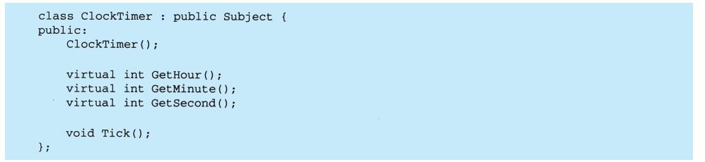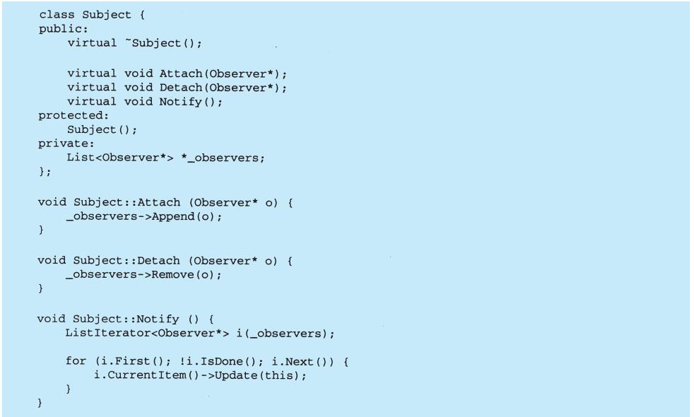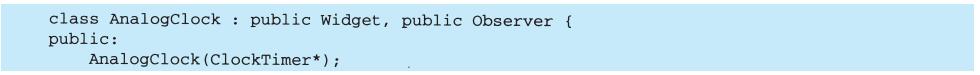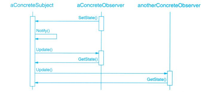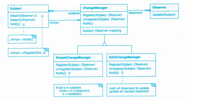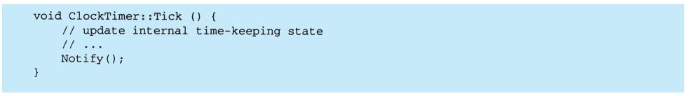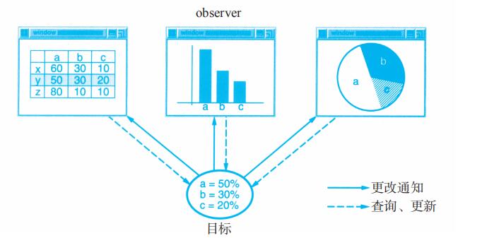 表面上看,这个例子反映了将视图和模型分离的设计,然而这个设计还可用于解决更一般的问题:将对象分离,使得一个对象的改变能够影响另一些对象,而这个对象并不需要知道那些被影响的对象的细节。这个更一般的设计被描述成Observer(5.7)模式。