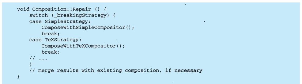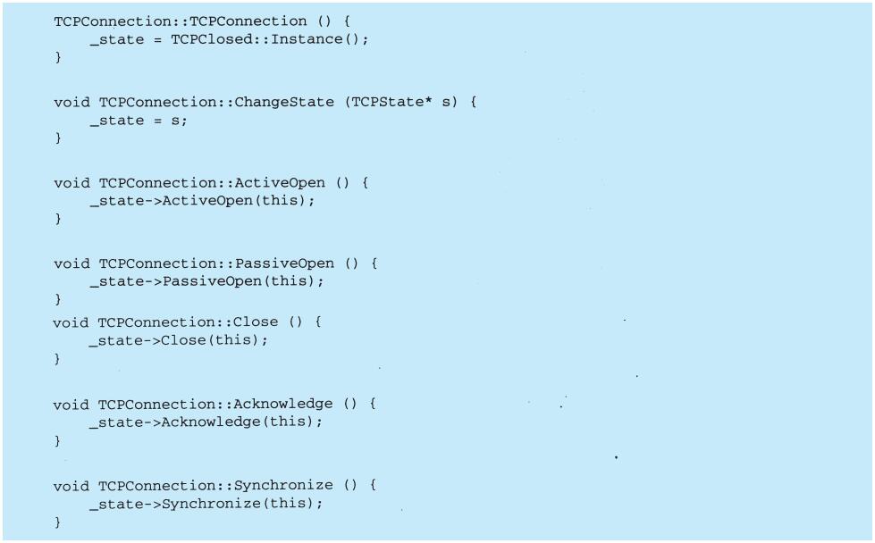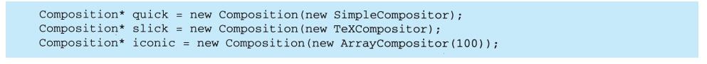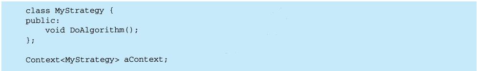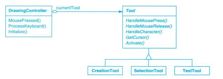 View-Controller关系是Strategy(5.9)模式的一个例子。一个策略是一个表述算法的对象。当你想静态或动态地替换一个算法,或你有很多不同的算法,或算法中包含你想封装的复杂数据结构时,策略模式是非常有用的。