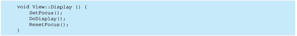 MVC的另一个特征是视图可以嵌套。例如,按钮控制面板可以用一个嵌套了按钮的复杂视图来实现。对象查看器的用户界面可由嵌套的视图构成,这些视图又可复用于调试器。MVC用View类的子类——CompositeView类来支持嵌套视图。CompositeView类的对象行为类似于View类的对象行为,一个组合视图可用于任何视图可用的地方,但是它包含并管理嵌套视图。