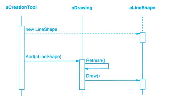 在图B-3中,第一个请求是aCreatinTool发出的,请求创建aLineShape。接下来,aLineShape被加入aDrawing中,这导致aDrawing向它自身发出一个Refresh请求。而在Refresh操作过程中aDrawing又向aLineShape发出一个Draw请求。