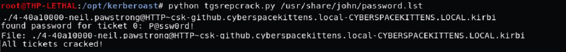 通过CSK公司的实验室设备,您可以使用修改后的EternalBlue漏洞在实验室网络中的众多Windows 7系统上生成SMB信标静荷。使用所有新Shell,您开始获取大量信息。您注意到其中一个系统与名为Restricted的远程Microsoft SQL服务器具有活动连接。您可以尝试实验室网络上的所有账户,但这些用户名和密码都不适用于此数据库。您回过头来查看所有笔记并意识到……您忘记了Kerberos“门票”!您可以通过SSH连接到破解设备,查看输出,查找链接到Restricted数据库的故障单。您找到了该服务账户的密码!