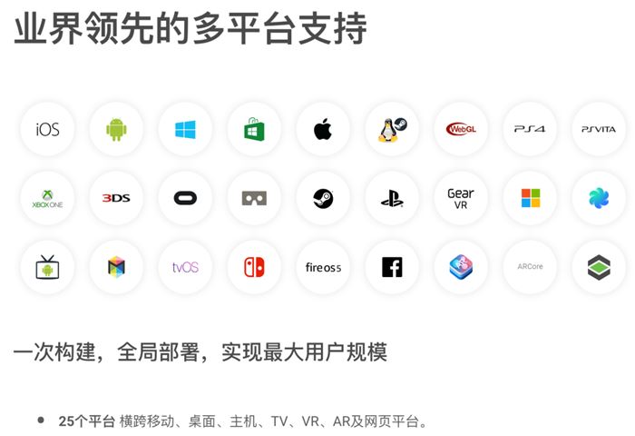 Unity是一个跨平台游戏引擎,其中跨平台分为开发跨平台和发布跨平台。开发跨平台就是开发者可以在不同的操作系统下开发Unity游戏,目前可以跨Windows和macOS这两种操作系统。而发布跨平台则表示使用Unity开发出来的游戏能在多平台下运行。如图1-1所示,目前Unity已经可以横跨25个主流游戏平台,是不是很强大呢?不过每个平台可能有些自己特有的需求,详细的跨平台信息可以在如下网址中查阅到:https://unity3d.com/cn/unity/features/multiplatform 。
