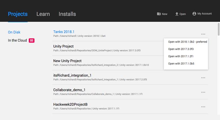 通过以上这些版本的介绍,我们可以发现Unity的版本其实是很多的。通常,在实际开发中,为了测试多个版本之间的差异性,很有可能需要同时安装好几个版本,如何管理就成了一个难题。还好,Unity提供了新工具Unity Hub来专门管理多版本(目前还是预览版)。如图1-2所示,打开Unity Hub后,可以安装与管理多个不同的Unity版本,并且可以很方便地用指定版本打开不同的游戏工程。有关Unity Hub的详细介绍,可以参考这里:https://blogs.unity3d.com/cn/2018/01/24/streamline-your-workflow-introducing-unity-hub-beta/ 。