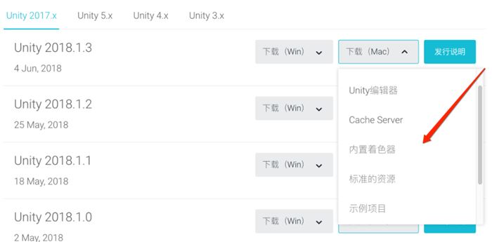 另外,由于开发周期比较长,开发版本很有可能已经和最新版本相差很远了,所以有时还需要快速找到Unity的旧版本,此时可以通过如下链接找到:https://unity3d.com/cn/get-unity/download/archive 。
