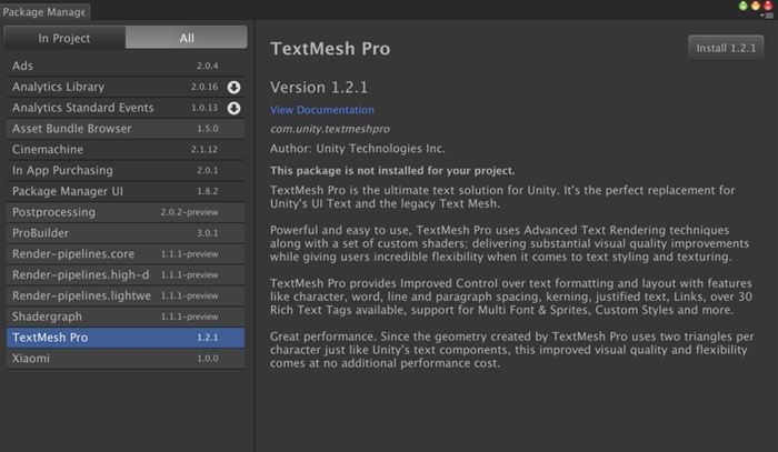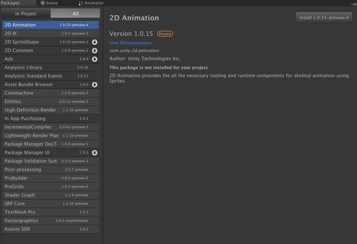 打开Unity引擎后,在导航菜单栏中选择Window→Package Manager菜单项,即可打开资源包管理器。如图1-4所示,Unity会将比较重要的一些包放在Package Manager中,这样可以极大限度地为引擎瘦身。开发者只需要选择下载自己需要的包即可。可以看到,目前这里大部分都标记了preview字样,未来的功能会越来越完善。