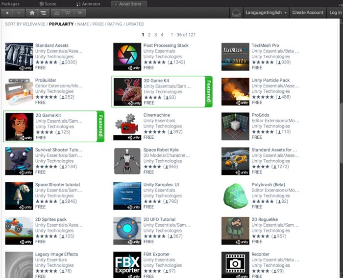 此外,Unity还提供了资源商店(Asset Store),在导航菜单栏中选择Window→Asset Store即可打开。这里面有很多好用的资源以及代码插件,当然有些是需要支付一定费用的。Unity自己也提供了大量的插件以及资源,并且都是免费的,非常适合新手来学习。如图1-5所示,在搜索栏中搜索你感兴趣的内容,即可得到相关的插件。很炫酷吧!