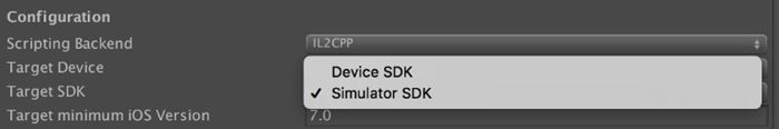 导入示例项目,这里是在Asset Store中下载并且导入Unity最经典的angryBots项目。首先,需要在导航菜单栏中选择Edit→Project Settings→Player。默认情况下,Unity会选择Device SDK(它表示只能导出到真机上运行),这里我们选择Simulator SDK(表示可以在模拟器上运行),如图1-6所示。