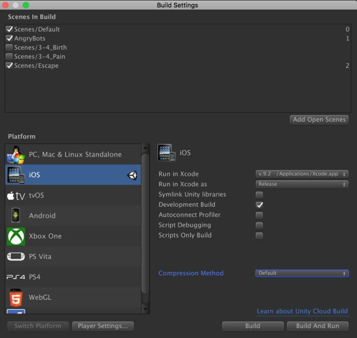 在左下方的Platform处,选择待打包的游戏平台。这里列出的平台需要下载对应的支持,这里选择iOS平台,表示可以打包iPhone或者iPad。右侧是用于设置打包的参数,下面简要介绍各个参数的作用。