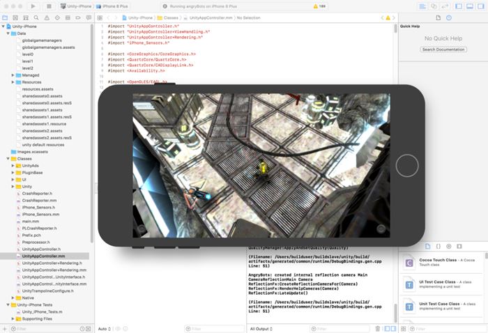 参数设置完毕后,点击Build或者Build And Run按钮即可。由于iOS平台比较特殊,需要预先生成Xcode工程,所以这里点击的构建并非真正构建成IPA安装文件。运行后,经典的angryBots项目已经在模拟器中打开了,如图1-8所示。