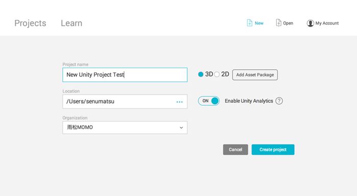 打开Unity,点击右上角的New按钮即可创建游戏项目,如图2-1所示。根据游戏类型,可以选择3D或2D,它将影响后面SceneView视图的样式。Add Asset Package按钮可以给即将创建的工程添加预制游戏包。如果需要启动Unity分析器,请打开Enable Unity Analytics(该选项建议打开)。接着输入正确的Project name(项目名称)和Location(项目路径),确认无误后点击Create project(创建项目)按钮,Unity就会自动打开这个项目了。