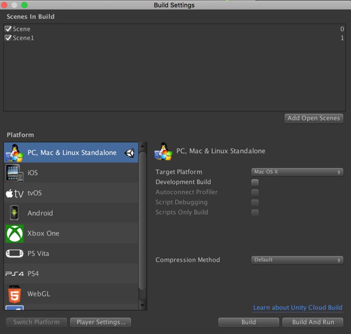 接着,在导航菜单栏中选择File→Build Settings菜单项,此时会弹出构建窗口。如图1-7所示,在Scenes In Build中添加待打包的场景,只需打开需要打包的场景后,点击Add Open Scenes按钮即可。这里提供一个技巧,如果不需要打包某些场景,可以在该窗口中删除它或者取消勾选。