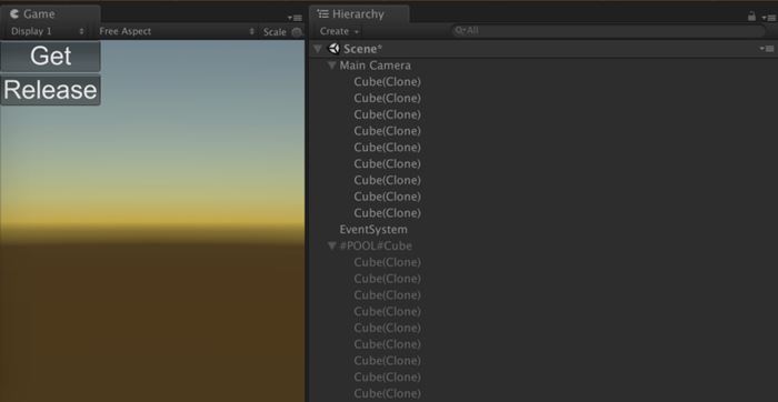 如图13-36所示,点击Get按钮即可从缓存池中获取对象,如果没有,则创建新的。点击Release按钮,则将创建过的对象放回至缓存池中,并且设置它为隐藏状态。