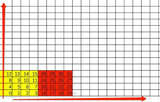 但是其实游戏中很少使用RGBA32,大多数情况都使用压缩贴图,比如DXT5、ETC2_RGBA8和ASTC_RGBA_4x4。如图13-40所示,它们的像素排列格式是按照4×4(每16个)为一个单位进行排列,总的排列顺序依然是从左到右,从下到上。