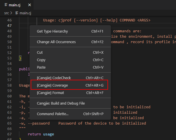 在 VSCode 的代码编辑区右键选择 [Cangjie] Coverage 或者用快捷键 Ctrl+Alt+G 执行生成当前仓颉文件覆盖率报告的命令。如下图: