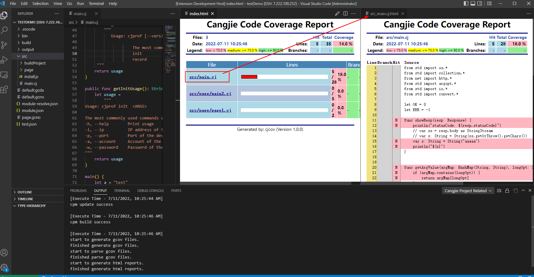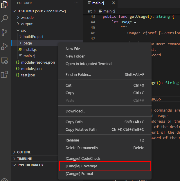 在 VSCode 的资源管理器中选择文件或者文件夹右键执行 [Cangjie] Coverage 命令,对选择的文件或者文件夹生成覆盖率报告。如下图: