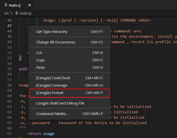 针对仓颉文件,在 VSCode 的代码编辑区右键选择 [Cangjie] Format 或者用快捷键 Ctrl+Alt+F 执行格式化命令,可以对当前仓颉文件进行格式化。如下图: