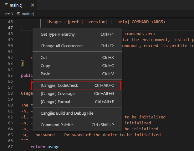 在 VSCode 的代码编辑区右键选择 [Cangjie] CodeCheck 或者用快捷键 Ctrl+Alt+C 执行静态检查命令 。如下图: