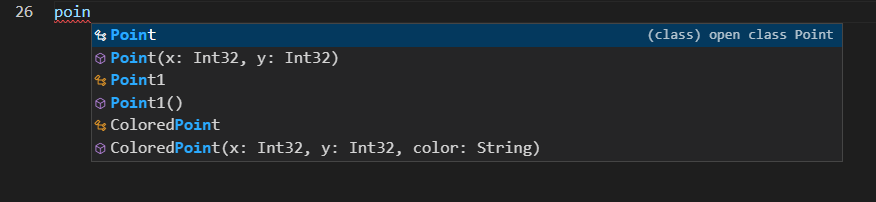 VSCode 打开 Cangjie 工程中的.cj 文件,输入关键字、变量或 “.” 符号,在光标右侧提示候选内容,如下所示,可以用上下方向键快速选择想要的内容(注:需要切换为系统默认输入法),回车补全。