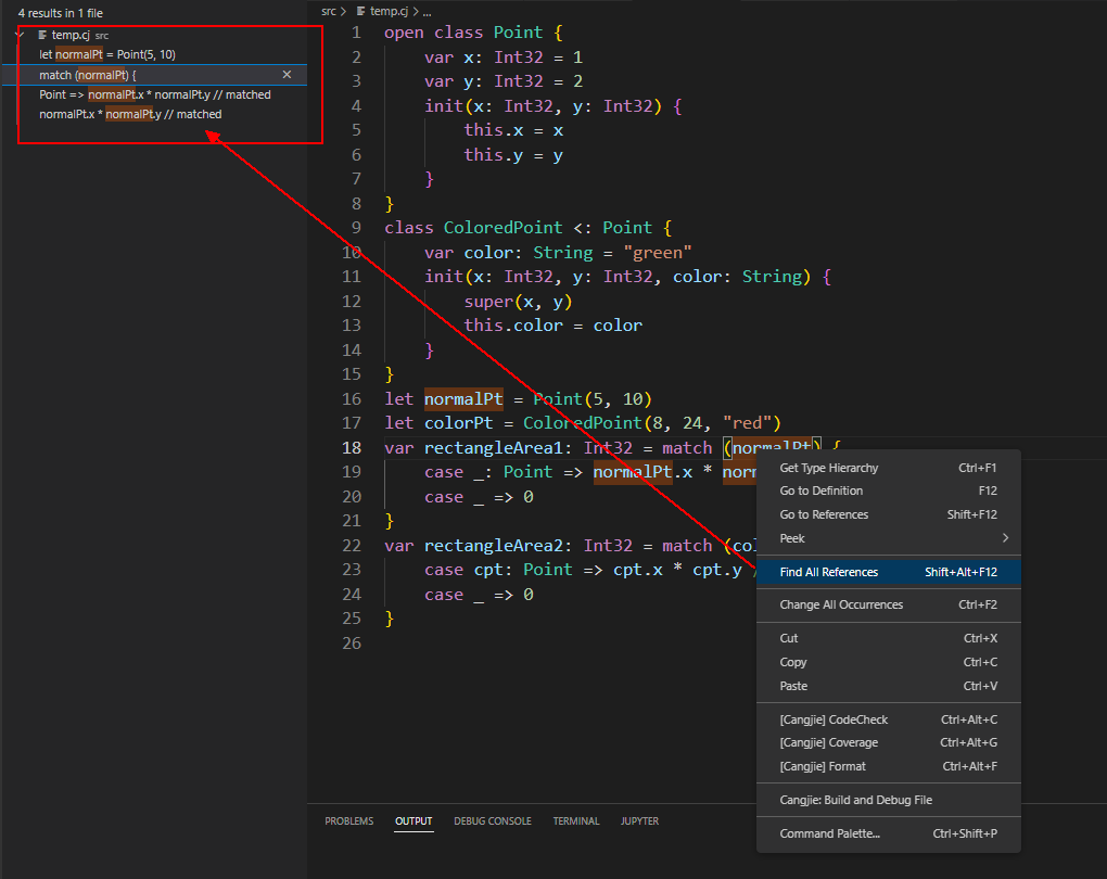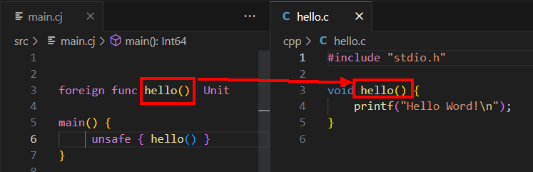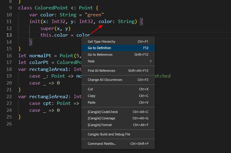 VSCode 打开 Cangjie 工程中的.cj 文件,鼠标悬停在目标上方 Ctrl + 单击鼠标左键触发定义跳转;或使用鼠标右键单击目标符号,选择 “Go to Definition” 执行定义跳转;或快捷键 F12 执行定义跳转,光标跳到定义处符号左端。