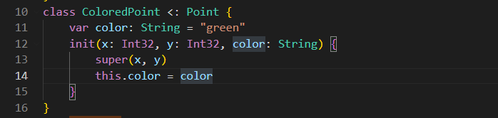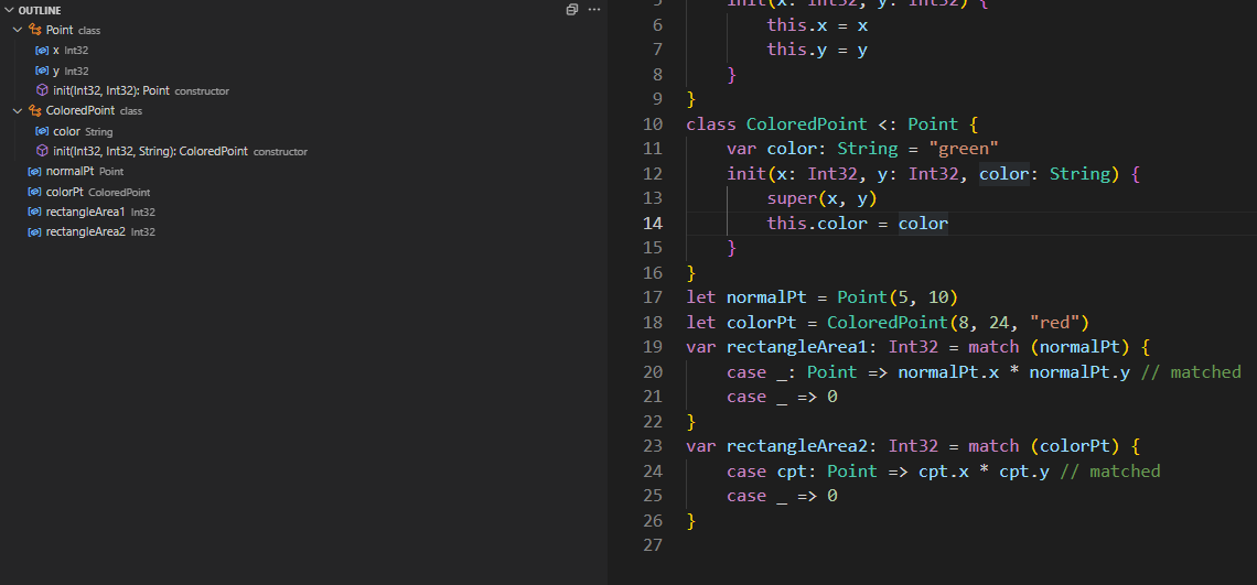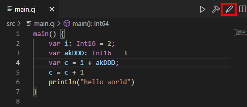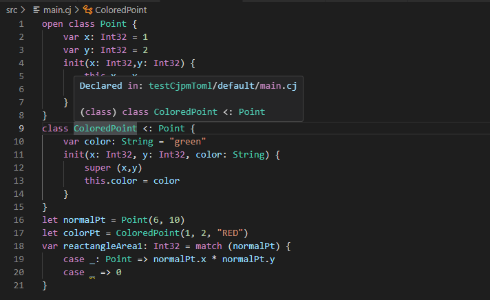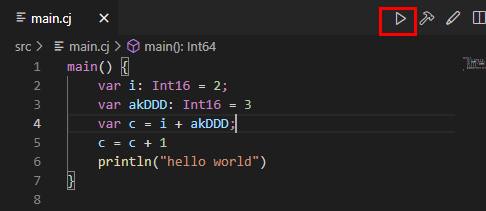 VSCode 打开 Cangjie 工程中的.cj 文件,即可看到效果,VSCode 不同主题显示的代码高亮颜色不同,如下所示的 dark+ 主题:关键字显示粉色,函数定义、引用符号为黄色,函数形参、变量符号为蓝色,注释为绿色等。