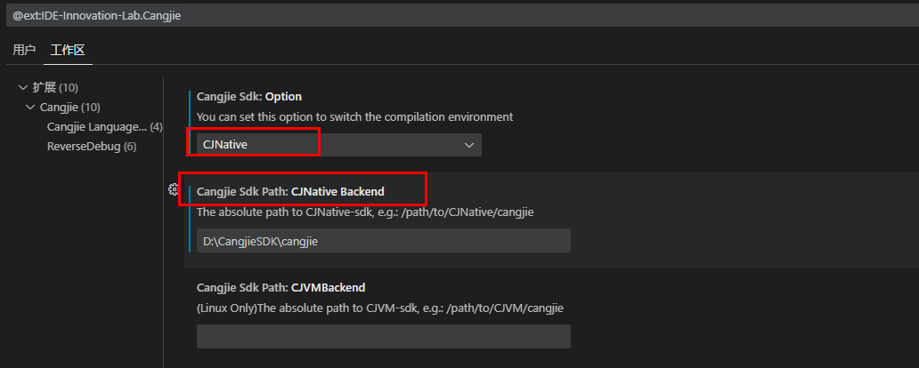 找到 Cangjie Sdk Path: CJNative Backend 选项,输入 CJNative 后端 SDK 文件所在绝对路径