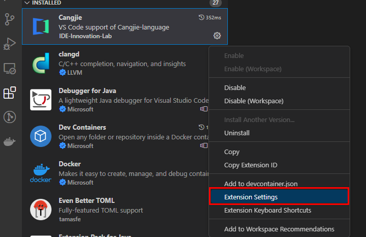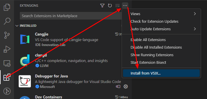 在搜索栏输入 cangjie, 然后选择侧边栏的 Cangjie Language Support 选项。
