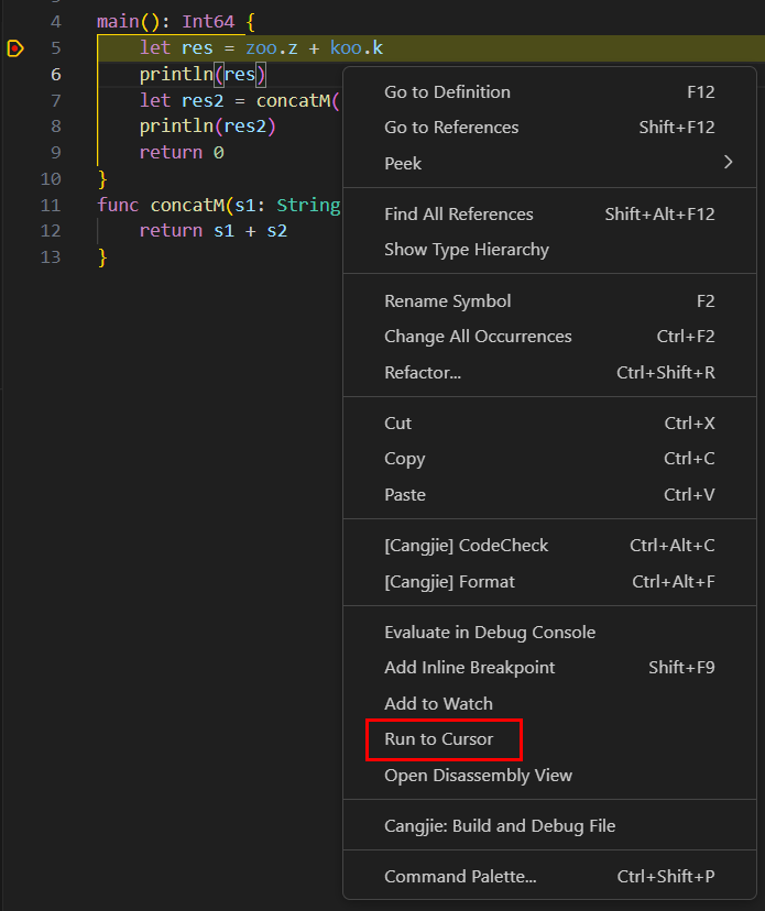 Cangjie: Add Reverse Breakpoint为光标所在行设置一个反向断点;