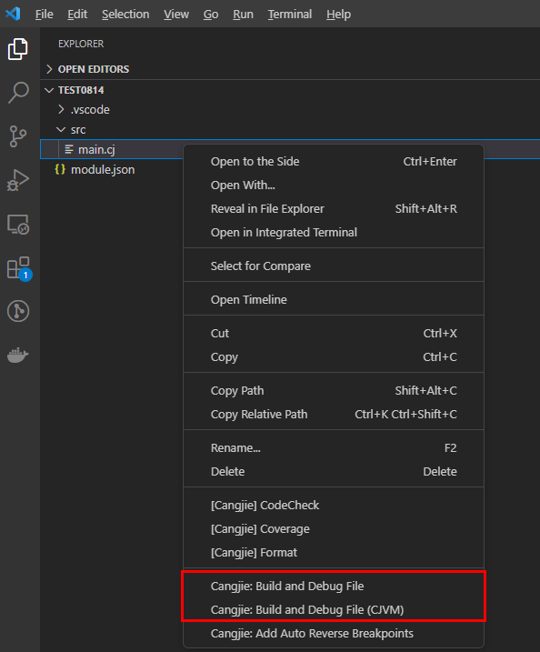 针对单文件调试,可以选中需要调试的仓颉源文件,右键选择 “Cangjie: Build and Debug File (CJVM)” ,该操作会生成编译配置文件 task.json 和编译脚本,并且会根据 task.json 配置执行脚本,编译出可调试的二进制文件,然后启动调试。