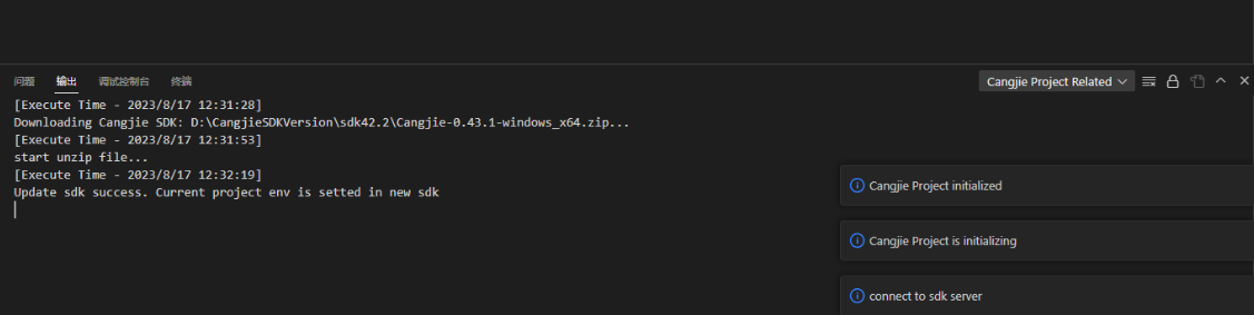 更新完成后,会自动重启语言服务器,随后您可以使用最新版本的仓颉 SDK 进行本地开发。