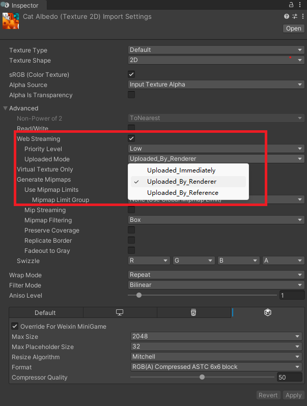 | Uploaded Mode | 表示贴图上传模式,默认是 uploaded immediately ,表示会被立即上传,上传时机和传统贴图一样。 uploaded reference 表示贴图只有被引用才会上传到 GPU 。 upload by renderer 表示贴图被场景中的 mesh renderer 或者 skinned mesh renderer 引用才会上传。 通常在游戏场景中除了场景中被 Mesh Renderer 和 Skinned Mesh Renderer 引用的贴图需要被设置为 upload by renderer 之外,其余均应该勾选 uploaded reference ,即通过引用去上传实际需要的贴图,当引用为0则及时释放该贴图的资源。 |
