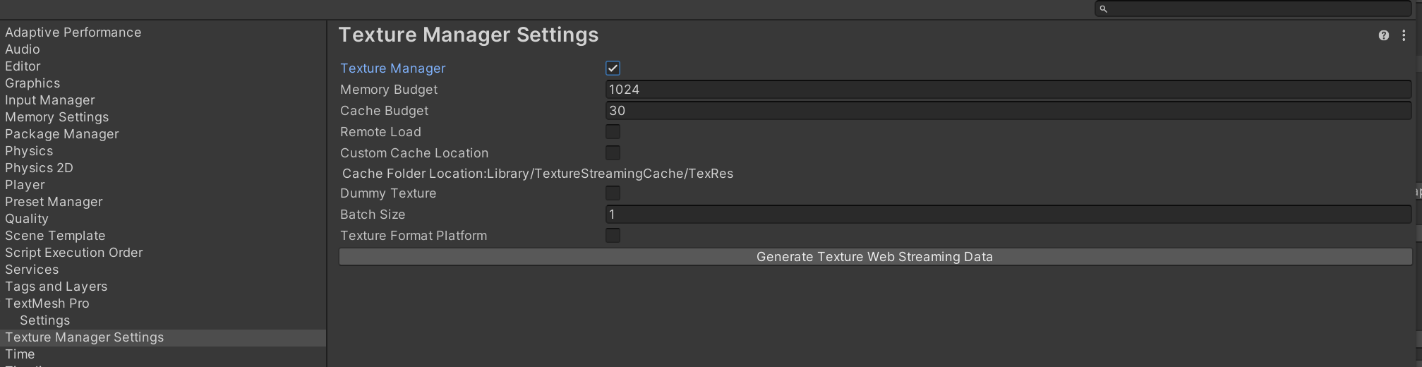 Texture Manager 默认是关闭状态,若需要开启,通过 Project Setting > Texture Manager Setting ,勾选 Texture Manager。