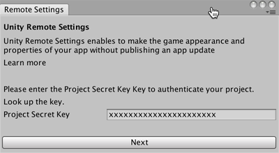 4.输入 Analytics 项目的 Project Secret Key__,然后单击 Next。 您可以在 Unity Analytics Dashboard 的 Configure__ 选项卡下找到自己的 Project Secret Key