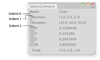 public class EditorGUIIndent : EditorWindow { [MenuItem("Examples/indentLevel demo")] static void Init() { EditorWindow window = GetWindow(typeof(EditorGUIIndent)); window.position = new Rect(100, 100, 300, 150); window.Show(); }
