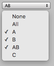 Displays a menu with an option for every value of the enum type when clicked. An option for the value 0 with name "Nothing" and an option for the value ~0 (that is, all bits set) with the name "Everything" are always displayed at the top of the menu. The names for the values 0 and ~0 can be overriden by defining these values in the enum type.