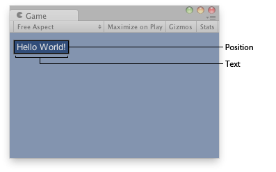 public class ExampleClass : MonoBehaviour { void OnGUI() { GUI.Label(new Rect(10, 10, 100, 20), "Hello World!"); } }