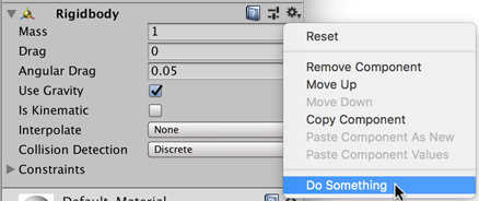 public class Something : EditorWindow { // Add menu item [MenuItem("CONTEXT/Rigidbody/Do Something")] static void DoSomething(MenuCommand command) { Rigidbody body = (Rigidbody)command.context; body.mass = 5; Debug.Log("Changed Rigidbody's Mass to " + body.mass + " from Context Menu..."); } }