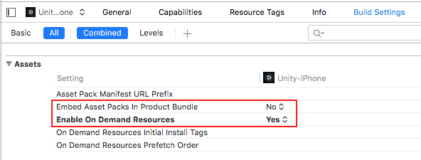 在 Xcode 中构建 .IPA 之前,请检查 XCode 的 Build Settings,确保 Assets 部分中的 Embed Asset packs In Product Bundle 设置为 No ,而 Enable On Demand Resources 设置为 Yes 。
