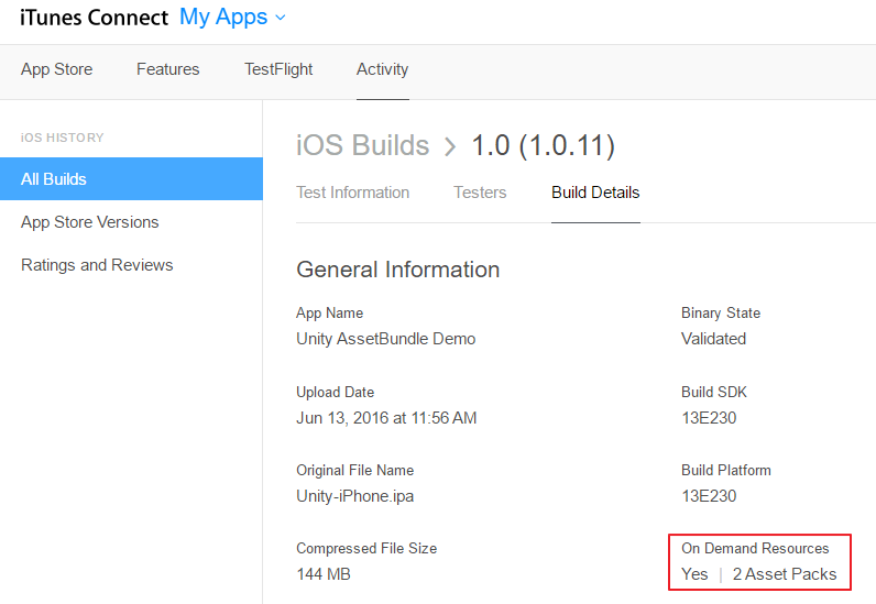 下一步是生成 Xcode 项目,构建 .IPA,并将其上传到 iTunes Connect 的 TestFlight。在 TestFlight 处理过程中,嵌入式 ODR AssetBundles 将从应用程序中删除并托管在 Apple 的服务器上,可供下载。