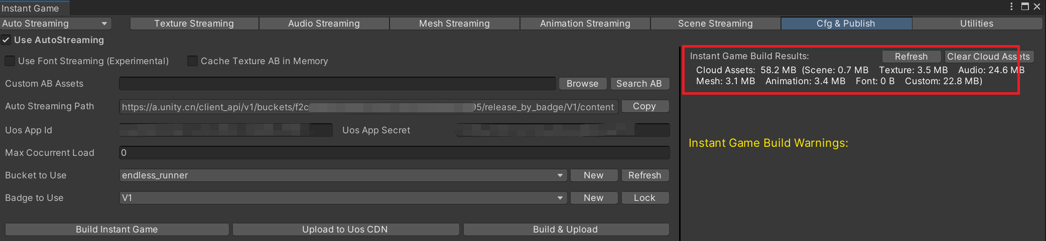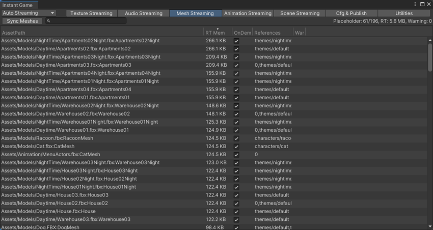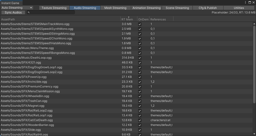 AutoStreaming 保留了这几类资源的对象,支持将本地较大的音频和mesh等资源内的数据从 游戏首包 / AB 中抽离出来,部署到 UOS CDN 服务器上。当游戏首次使用到该 Audio / Mesh / Animation 资源时,将触发引擎后台线程下载资源数据,完成后自动加载使用。
