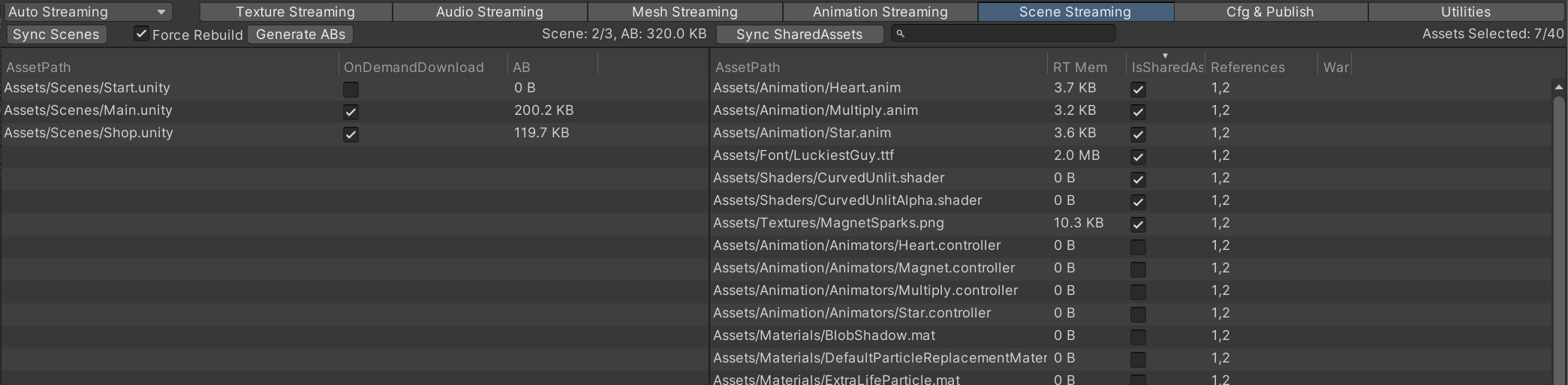 | Sync SharedAssets | 搜索勾选了Streaming的场景中的共同引用到的资源。 |