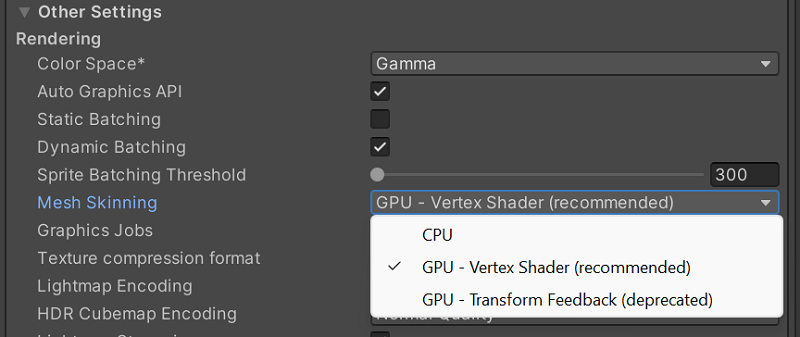 设置选项位于 Project Settings -> Player -> Other Settings ,下拉 Mesh Skinning 选择即可,默认使用 CPU Skinning 。