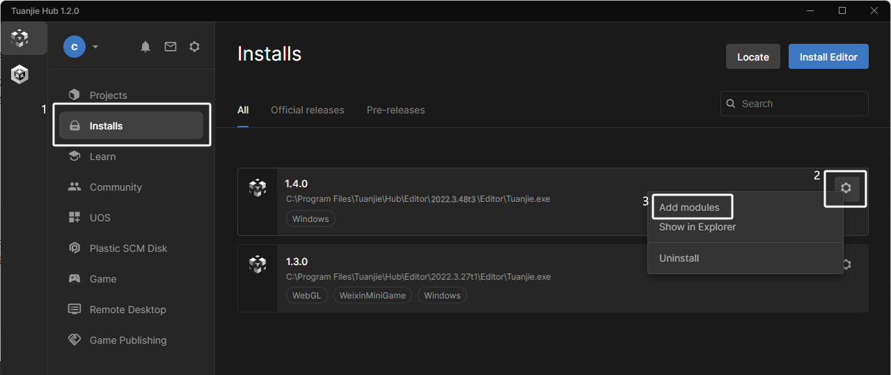 ,点击 Tuanjie Editor 1.4.0 及以上版本 的 “