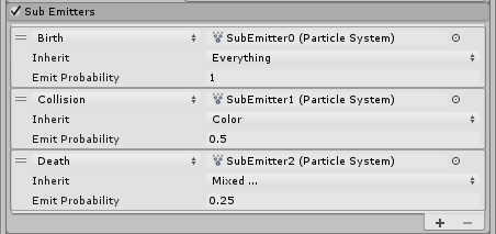 还可以通过设置 Emit Probability 属性来配置子发射器事件的触发概率。值为 1 可以保证事件将触发,而更小的值则会降低概率。
