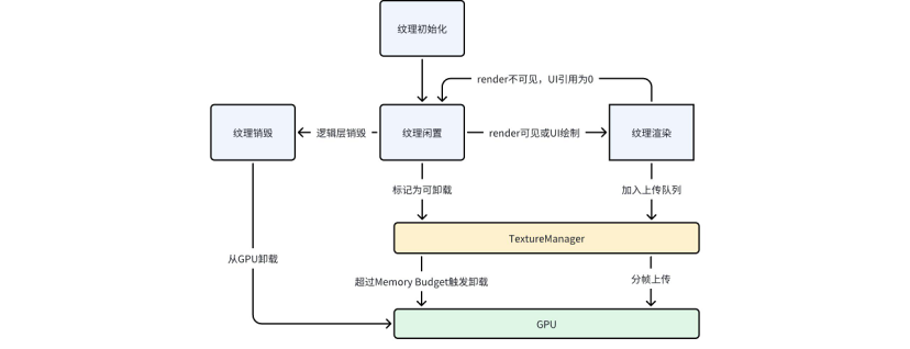 TextureManager 仅对纹理的 GPU 显存进行管理,不改变纹理对象的生命周期,纹理对象本身仍由原有的逻辑控制。 如下图所示,当纹理闲置,即当纹理 Renderer 不可见或者当前绘制 UI 对纹理的引用为0时,Texture Manager 标记纹理为可卸载,超出显存预算时将从 GPU 显存中卸载。当纹理重新处于渲染状态时,TextureManager 会再次执行步骤 2~4 ,上传纹理内容到 GPU 用于绘制。