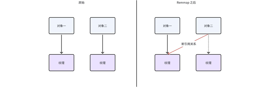 为了解决小游戏中的纹理冗余问题,TextureManager 在上传纹理到 GPU 前会先查看是否已有同样的纹理。发现重复纹理的情况下,会在底层进行映射,使其共用 GPU 上的同一张纹理,从而避免纹理冗余带来的显存开销。
