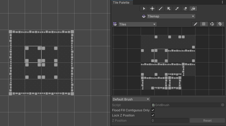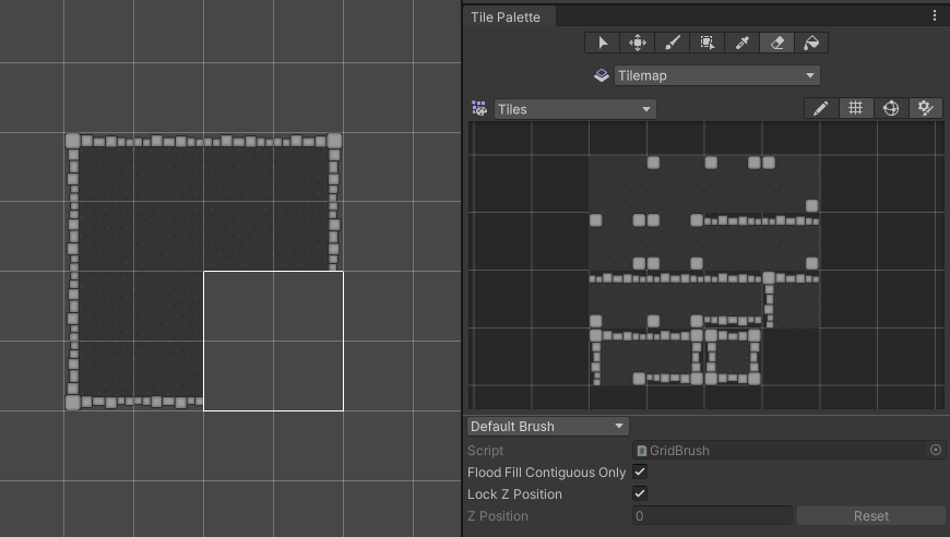 Selecting Tiles from the Tilemap Palette (right), then painting with the Box Fill Tool (left) on the Tilemap.